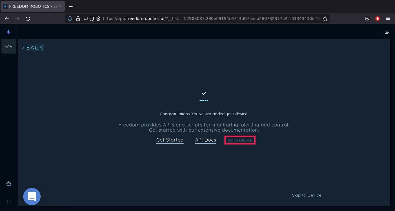After this step, adding a new device ends. But we haven't yet configured topics that will be visible in the Freedom Robotics; therefore, we click Go To Device.