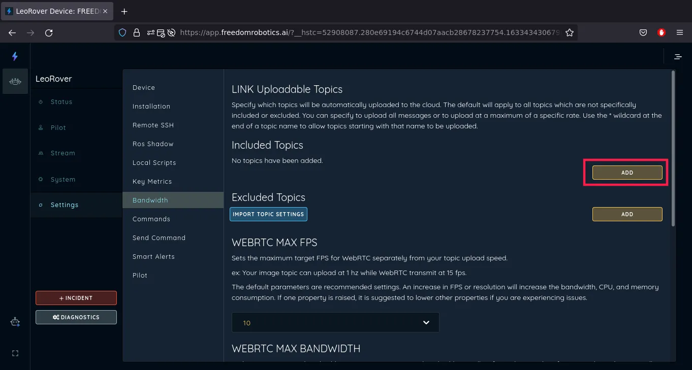 Now, connect to your device via Freedom Robotics and go to the device Settings and then go to the Bandwidth section.