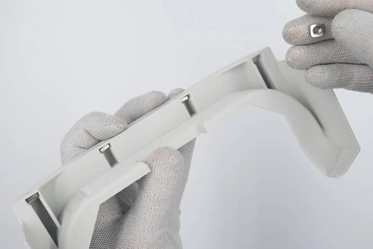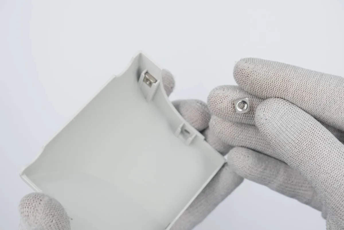 Insert 2x M4 square nuts in the additional quarter cover, one in each groove. Keep the cover tilted not to allow the nuts to fall off.